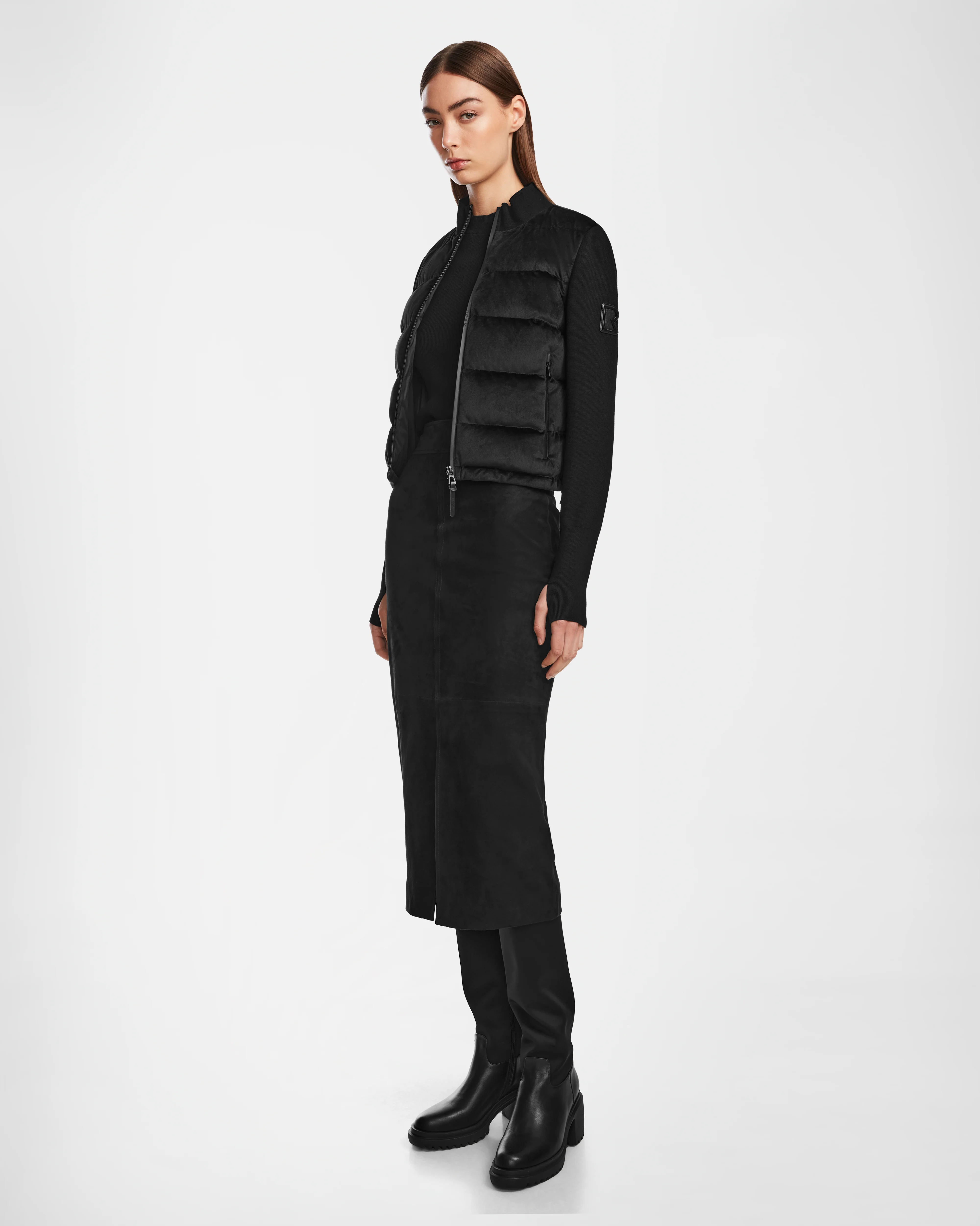 Meet your new fall essential, the CAMILLE V by RUDSAK, a versatile lightweight quilted jacket that seamlessly blends style and functionality. Designed with a luxurious velvet and knit sleeve and collar combo, it features a waterproof zipper, and waterproof side zipper pockets for practicality. The stretch knit sleeves ensure ease of movement, while the wind flap under the center front zipper enhances protection. Drawcords at the waist allow for customizable fit. Make the CAMILLE V is your go-to for stylish sophistication this season.