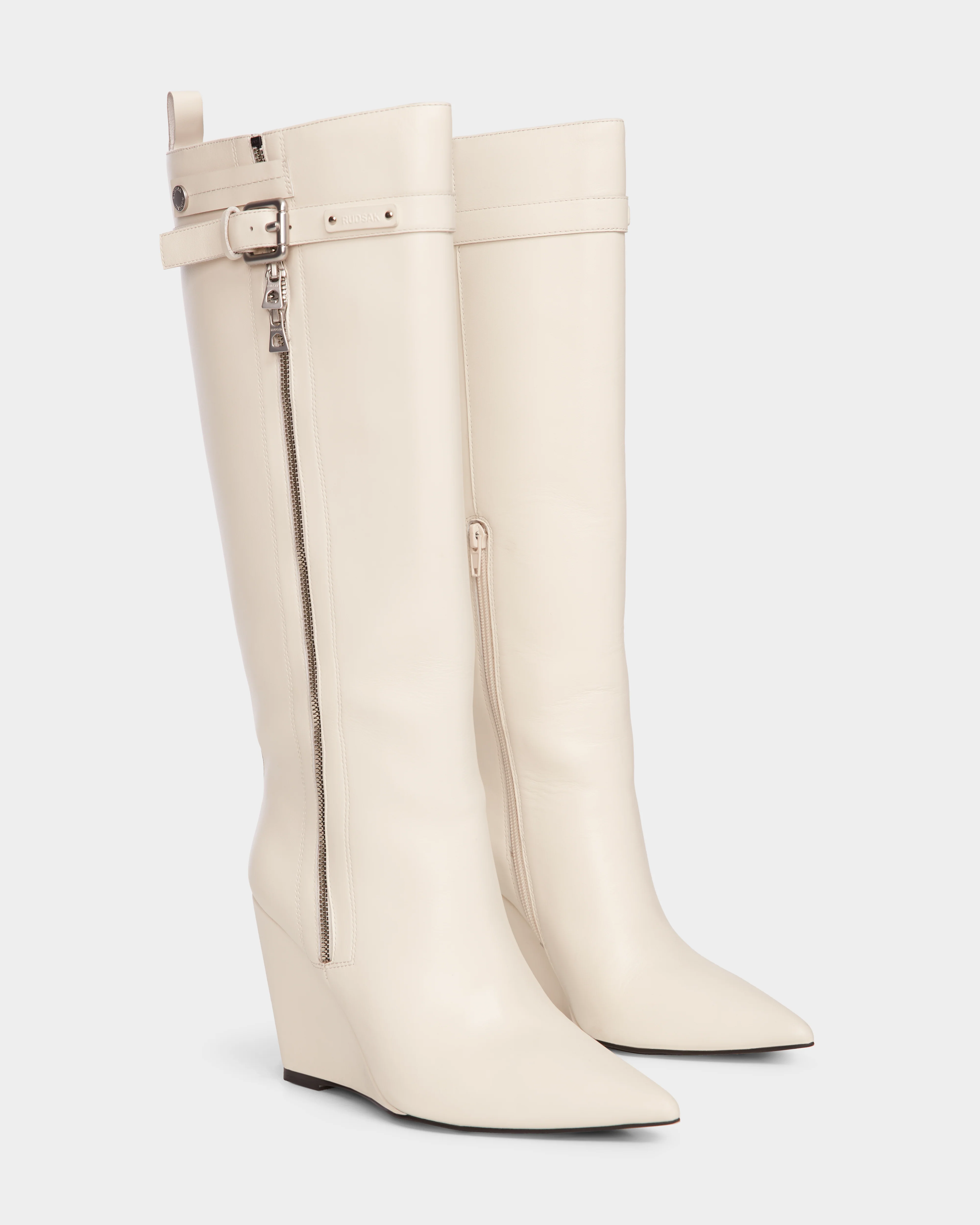 Elevate your look with the NANCY by RUDSAK, a women's high shaft wedge leather boot designed for standout style. Designed with a sleek pointed toe, stylish buckle accent, and eye-catching exposed zipper detail, these boots effortlessly fuse fashion with practicality. Upgrade your ensemble with the added height and comfort of the wedge heel, ensuring all-day wearability without compromising on style. Meticulously crafted from luxurious leather, the NANCY boots are a refined and versatile choice, perfectly suited for any occasion, adding a touch of sophistication to your wardrobe.