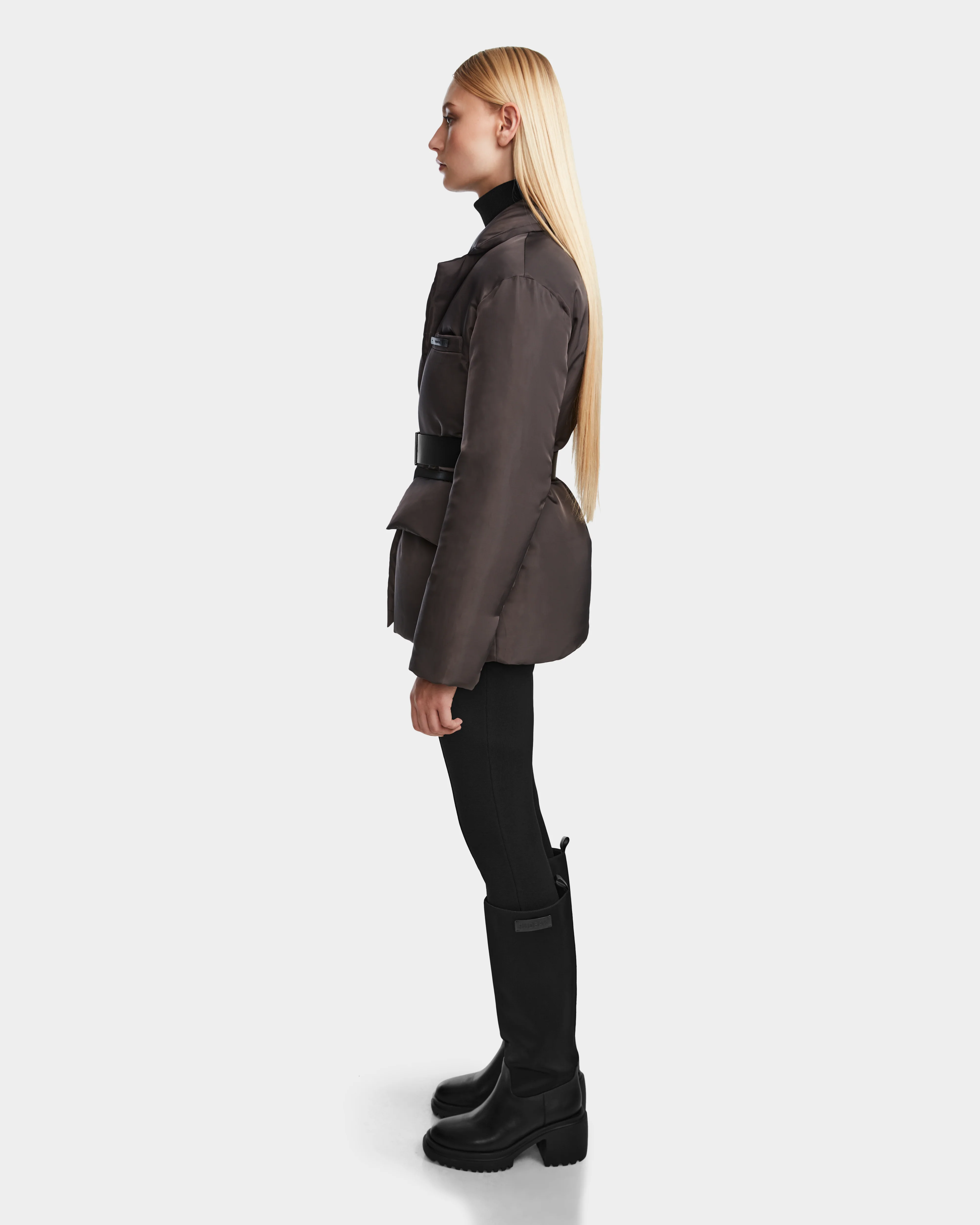 The PAOLA by RUDSAK is a women's down blazer puffer with a weather-resistant shell featuring a refined sheen. Insulated with high-loft RDS-certified down, it offers warmth while maintaining a sleek silhouette. The removable vegan leather belt and puffy pocket flaps, which can be tucked for a streamlined look, add versatility. Wind and water-repellent, this trend-forward piece combines professional polish with elevated everyday style, making it a standout addition to any fall and winter wardrobe.
