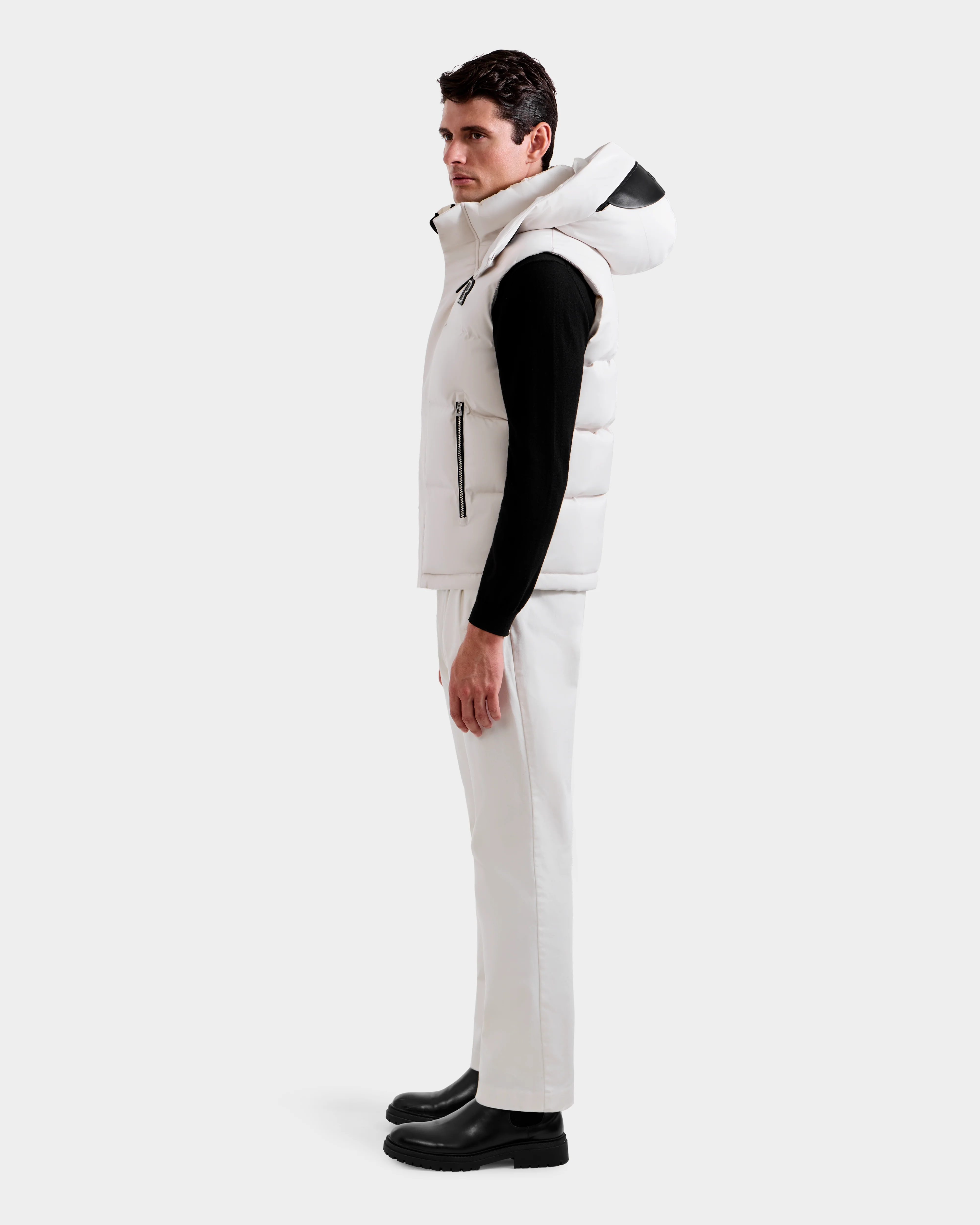 The REN H by RUDSAK is a men’s quilted down puffer vest built for warmth and versatility. Designed with a removable hood featuring a branded visor, vegan leather trims, and silver hardware, it delivers refined edge and utility. The body-fitting silhouette makes it perfect for layering over sweaters or shirts, offering insulation with a sleek, modern look. A cold-weather essential, the REN H merges technical function with elevated everyday style.